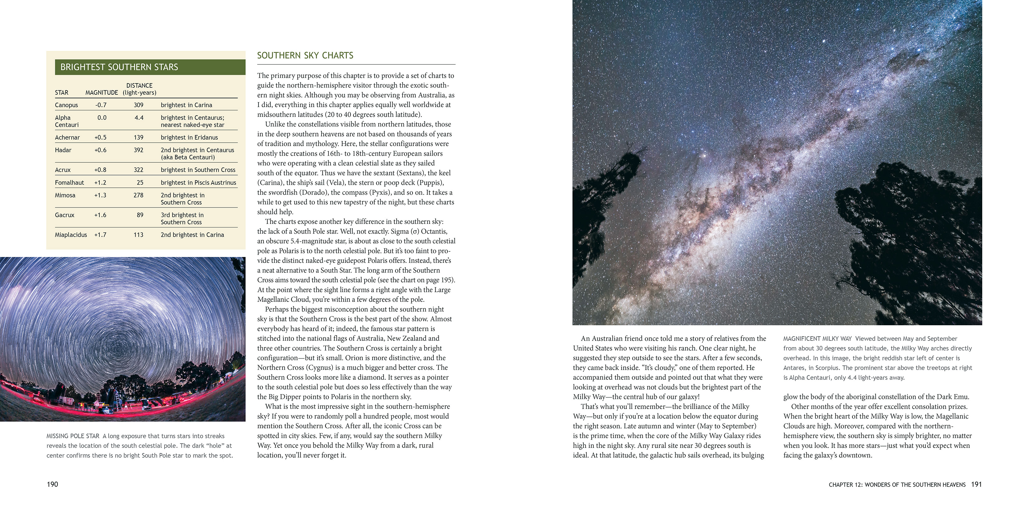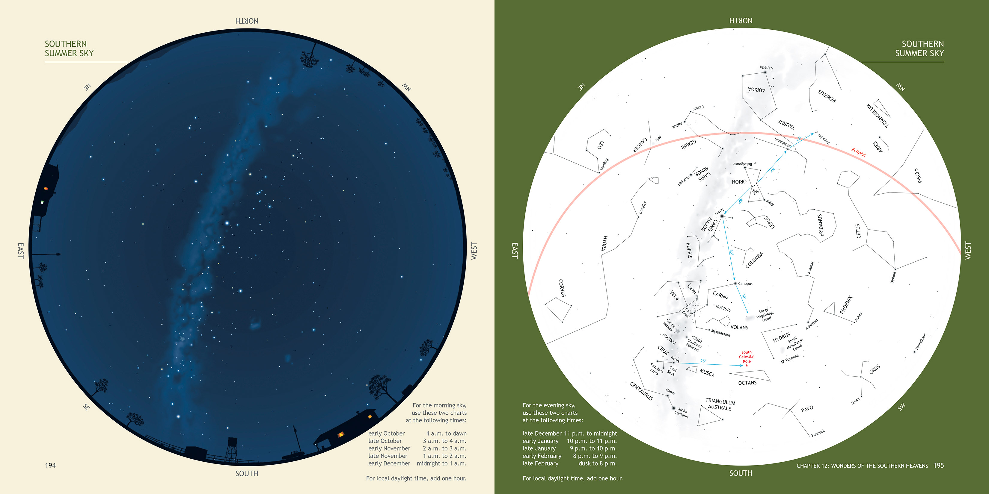 We travel far below the equator to experience the Southern Cross, the Magellanic Clouds and other marvels of the southern night sky. The four seasonal star maps, in the style of the northern seasonal charts in Chapter 4, can be used at locations near 30° south latitude (Australia; southern South America; southern Africa). Animations on our Videos page illustrate the motion of the southern sky.