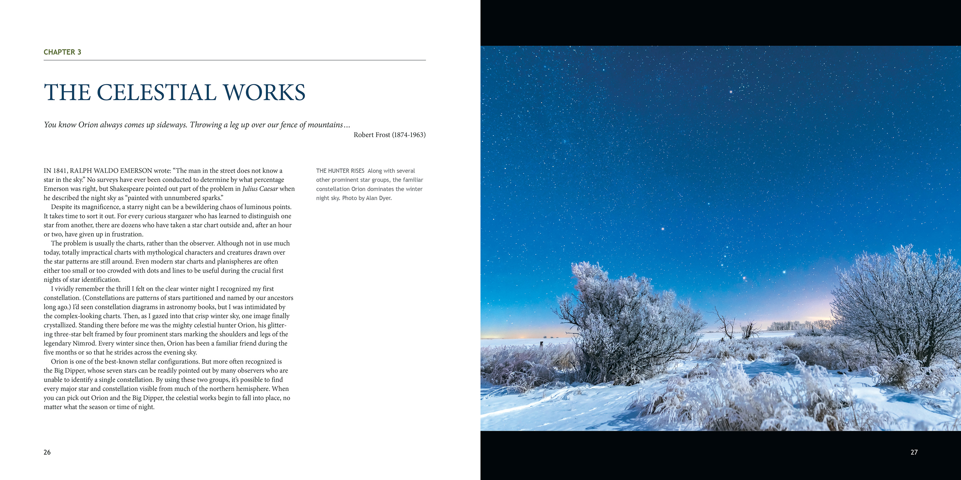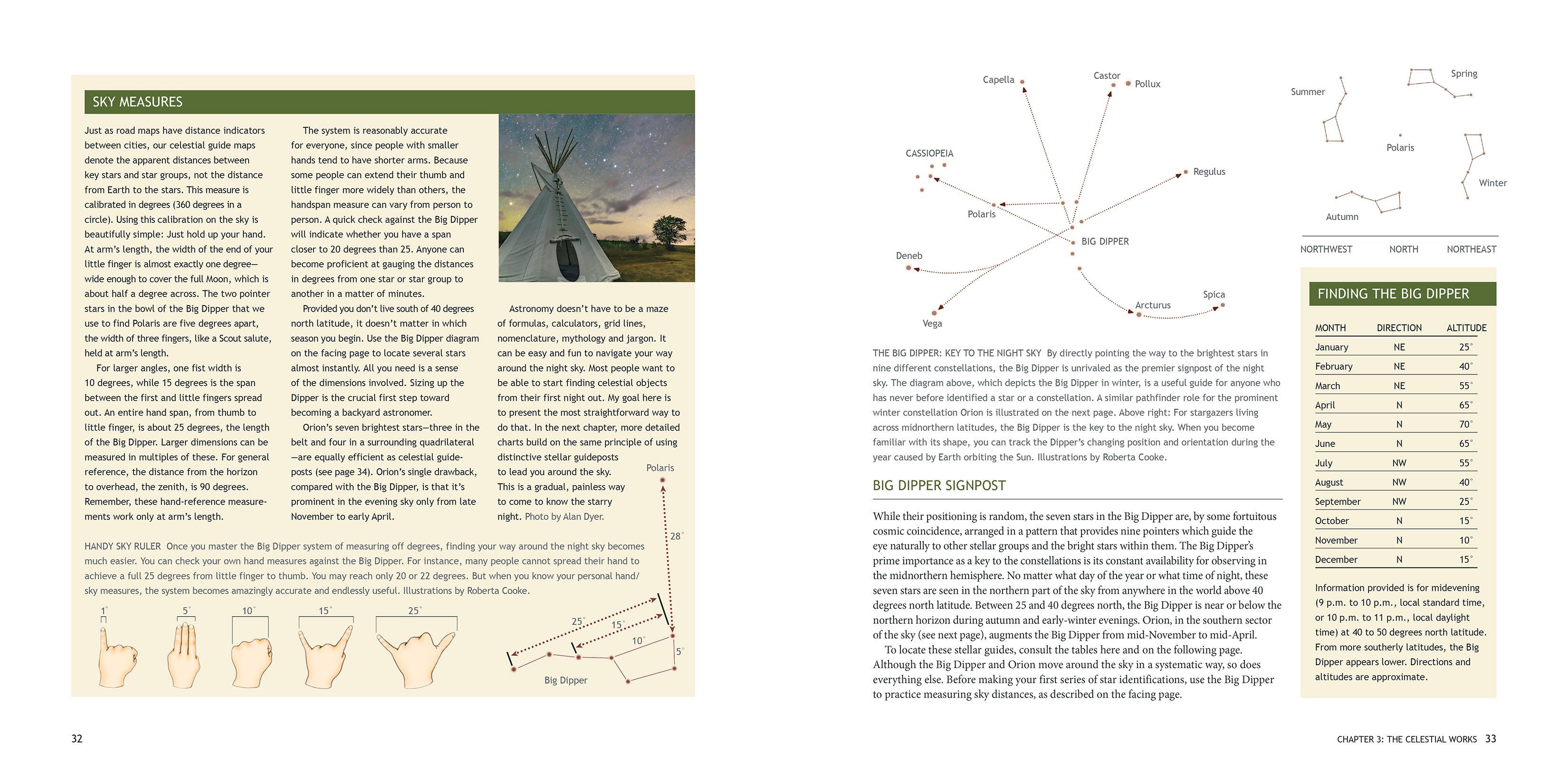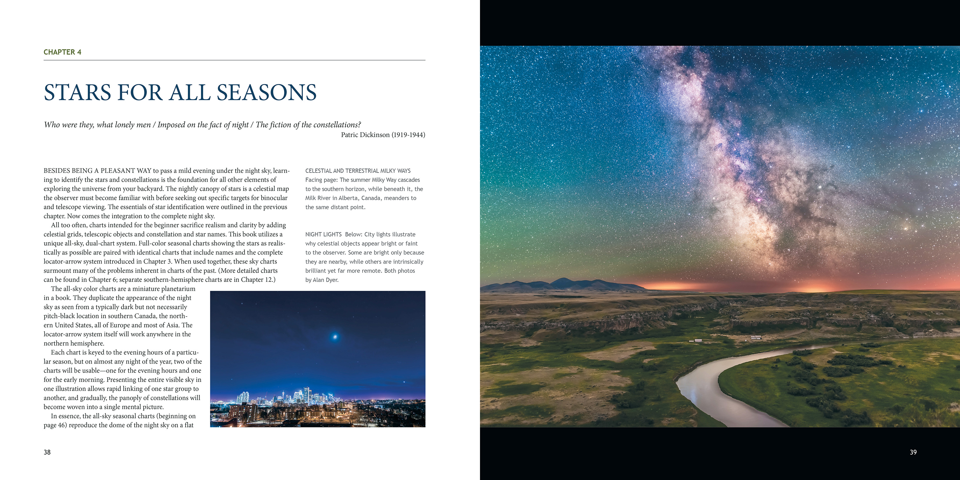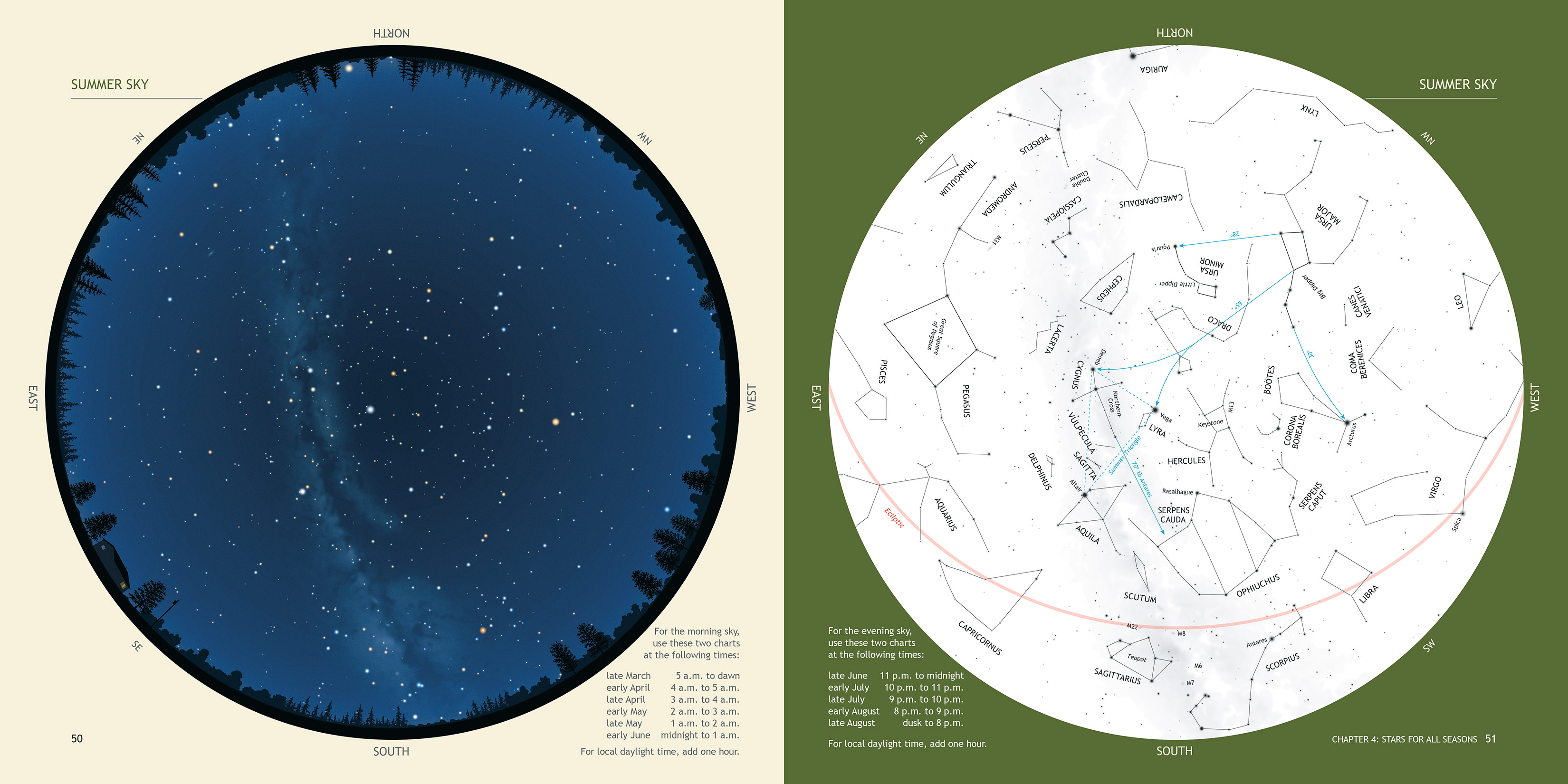 Our seasonal sky maps are unique. Each season is presented in two full-page maps. On the left is a realistic depiction of the night sky, and on the right a labeled chart with helpful arrows for locating key stars and constellations.