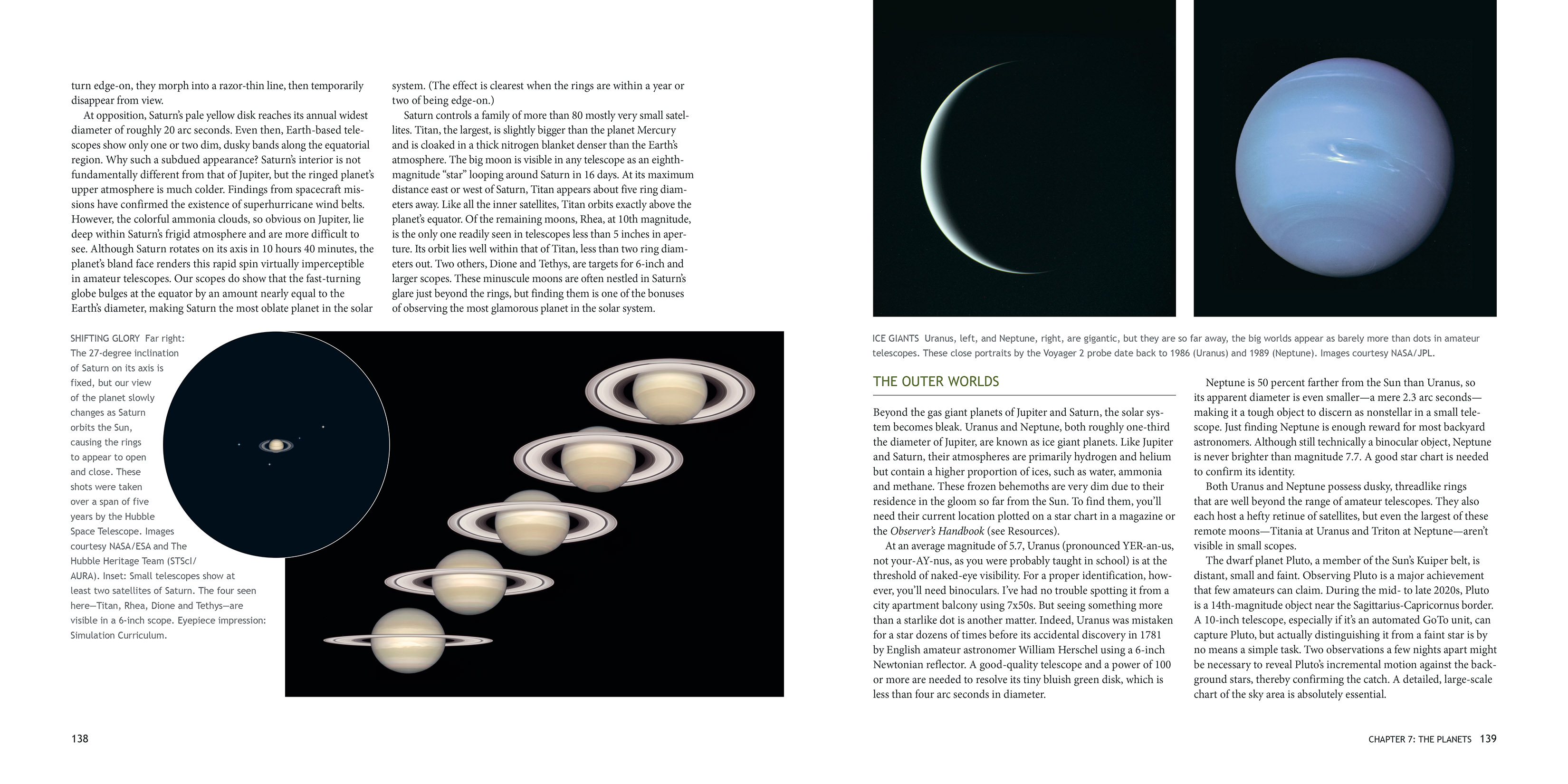 The focus here is our solar system. The planets are unique worlds in space, and we illustrate what these celestial bodies (and some of their moons) look like in backyard telescopes. Two pages of tables indicate where to look for the brighter planets to the year 2035 and when the best lunar and planetary conjunctions will occur.
