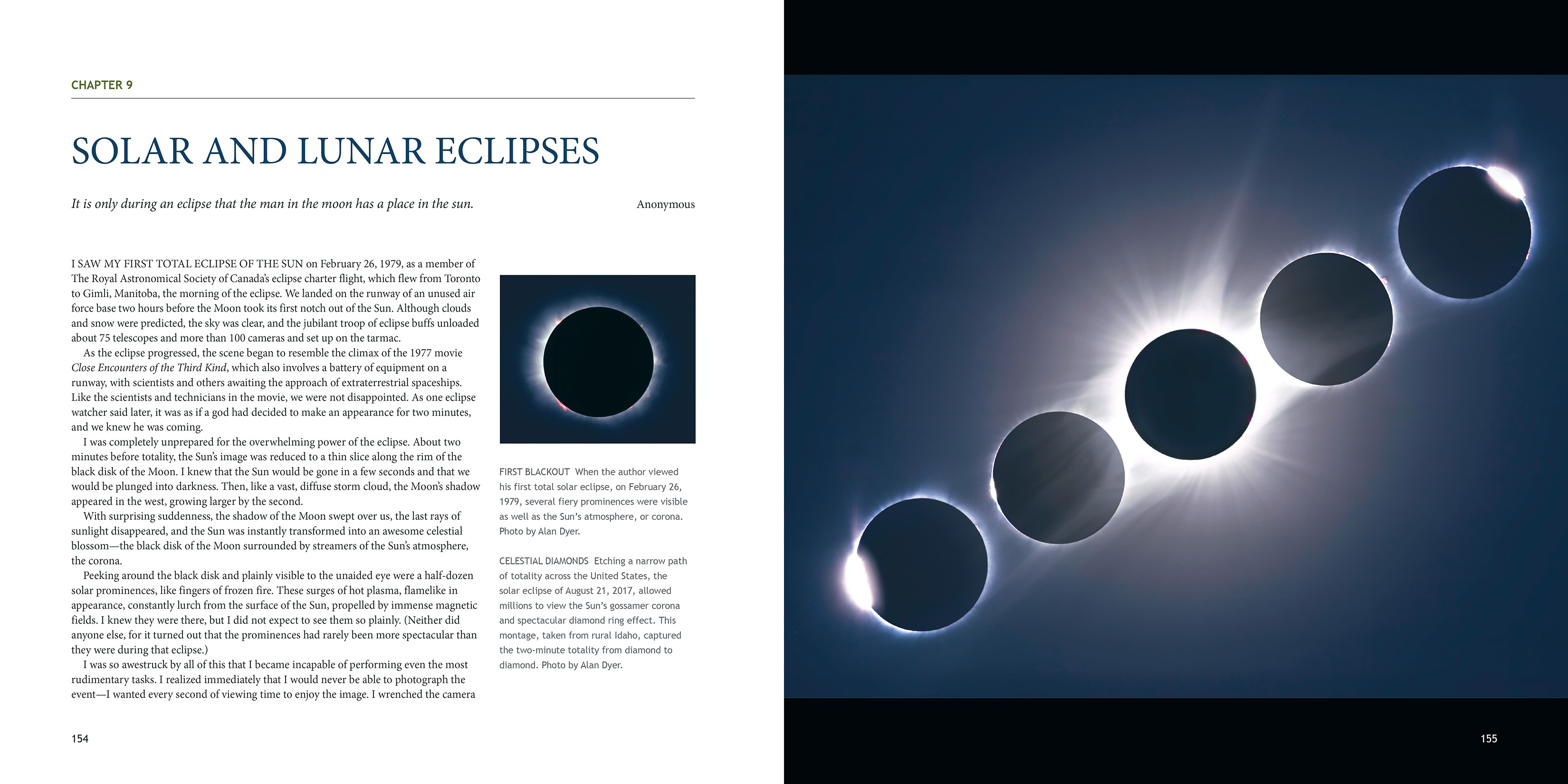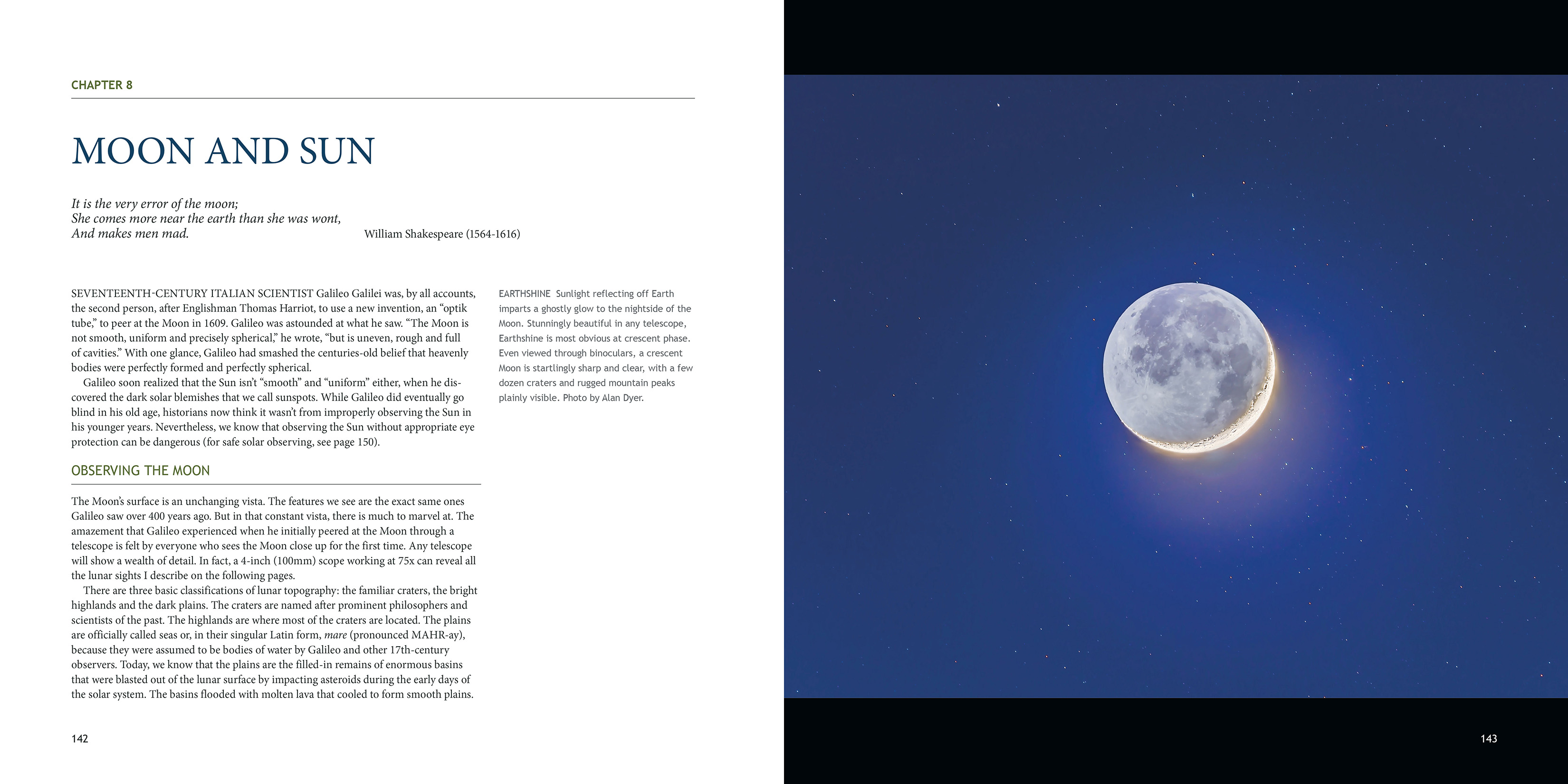We open with a detailed look at the cratered surface of the Moon. Photos and descriptive text clearly indicate features you can explore with any backyard telescope. We go on to explain how to view the Sun safely. Used carefully, a small telescope can detect the subtle, ever-changing surface of the Sun and the intricate structure of large sunspots. Specialized instruments magically reveal giant yet fragile solar prominences. Daytime astronomy is fun!
